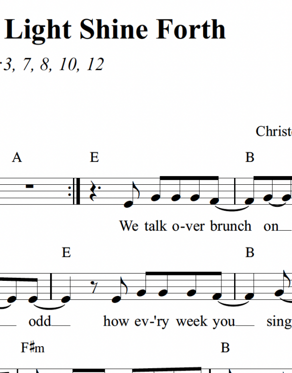 This upbeat, rock style song is based on Isaiah 58, inviting us into solidarity with the poor and reminding us our light can shine in the world. This lead sheet includes melody, lyrics and chords only, no piano accompaniment.